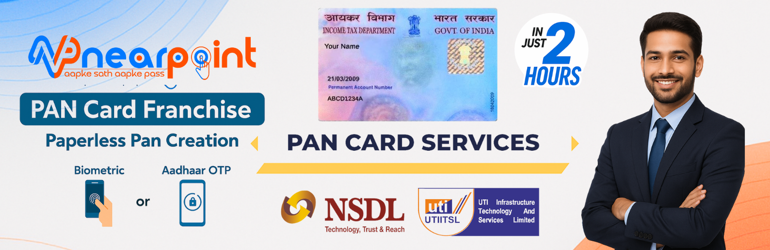 Near Point is a govt. registered company. specially we provide nsdl and uti pan card service and mobile & dth recharge, bill payment, dmt, aeps, m-atm through our website.also we provide many type of legal service . our business area is all over india.our all customer’s are valuable to us. we are happy to serve them better.to get better service get connect with us.